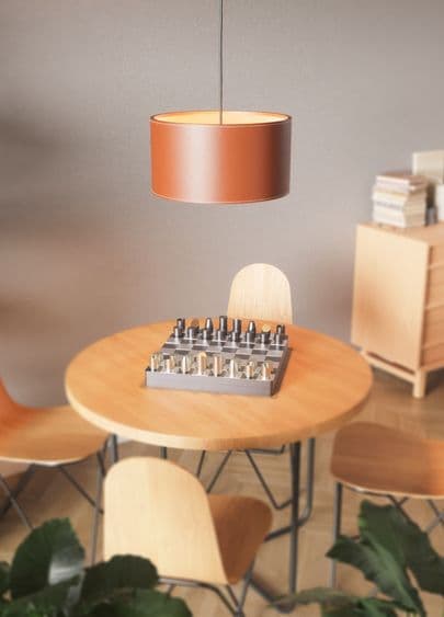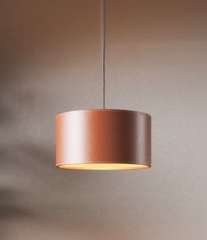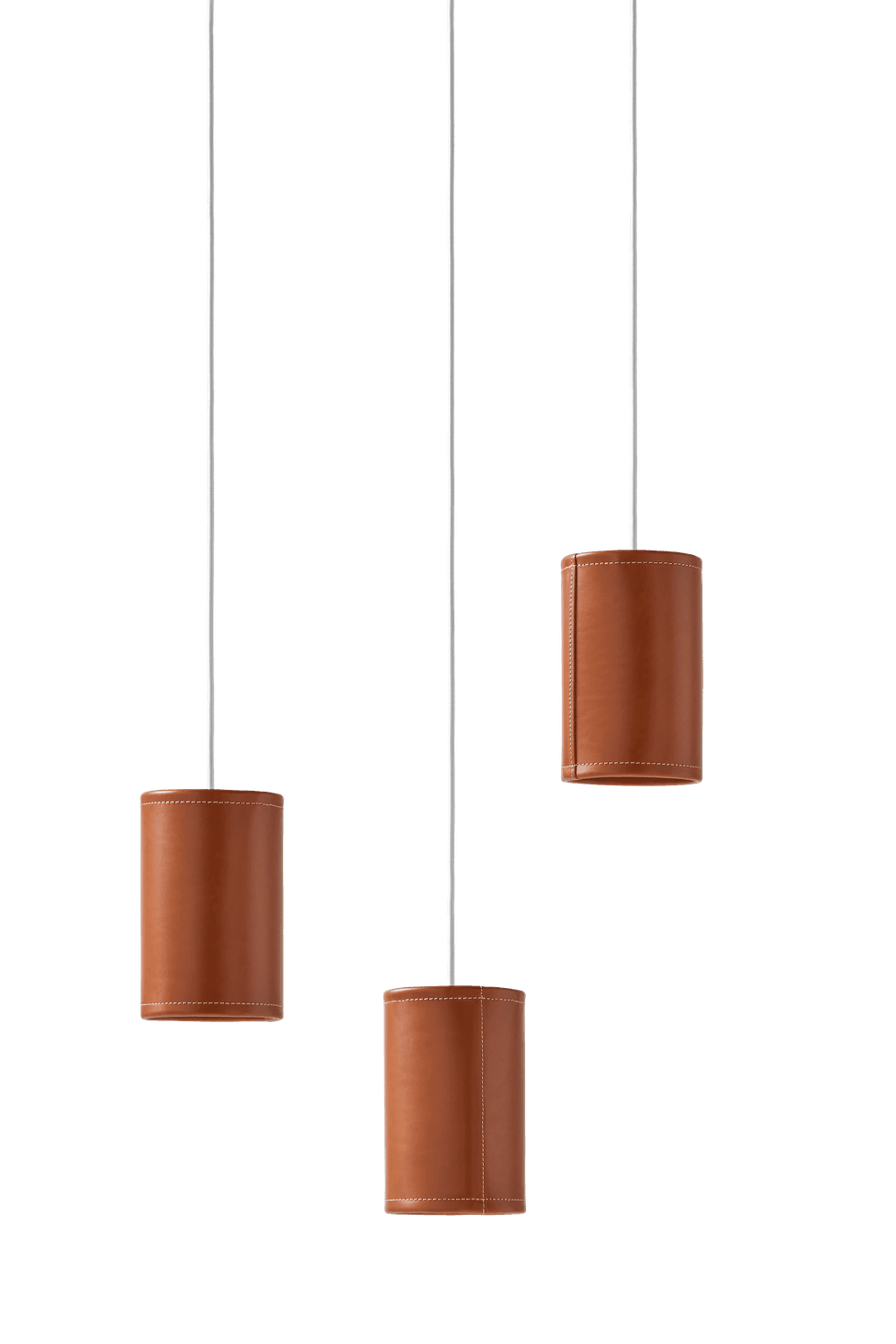 Luego se envía a Suecia, donde lo cortamos, lo cosemos y lo convertimos en estas hermosas lámparas cilíndricas de cuero.