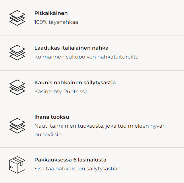 Nahkaiset lasinalusemme tummenevat ajan myötä ja kehittävät uniikin patinan, joka kertoo tarinan juomaseikkailuistasi.