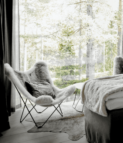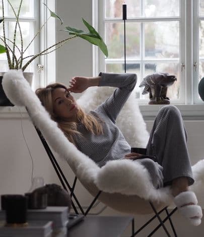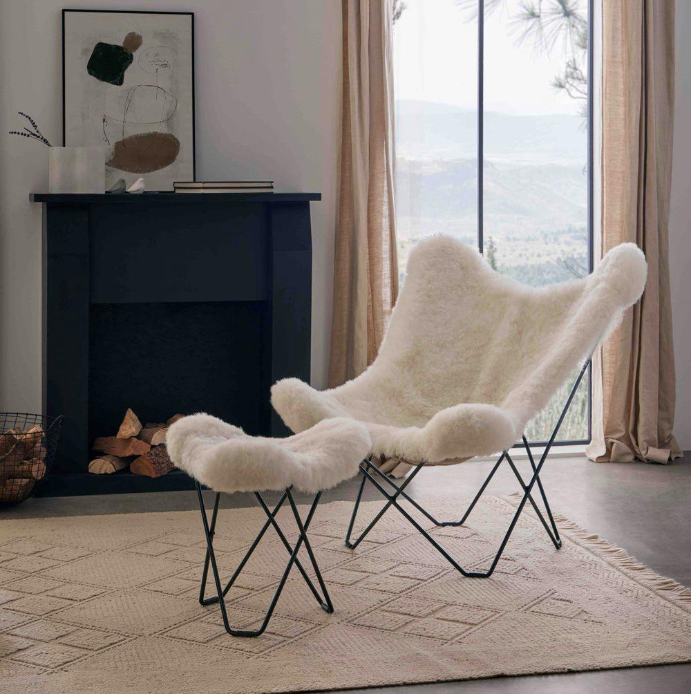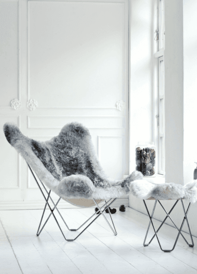 The best chair to keep you warm and comfortable during the coldest nights. Comfortable butterfly chair made with sheepskin from Iceland. Made in Sweden.