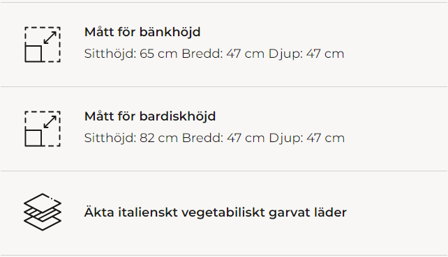 Eleganta och bekväma barstolar tillverkade i Sverige med speciellt italienskt läder. Ingen montering krävs. Öppna bara kartongen och njut av din drink.