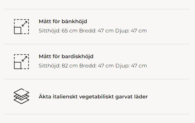 Lädret kommer från ett av de finaste garverierna i Italien och skickas till Sverige där vi väljer ut de bästa bitarna och tillverkar dessa bekväma sitsar för barstolar för hand.